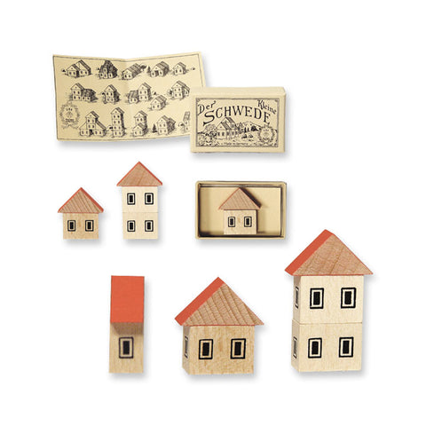 Quatre petits rectangles – les bâtiments – et trois petits triangles – les toits en pente – en bois imprimé, le tout dans une boîte en carton de la taille d'une boîte d'allumettes, invitent à concrétiser des projets d'urbanisme. Et si l'on choisit finalement un groupe de gratte-ciel, il suffit d'intégrer deux « petits Suédois » au projet. Sept pièces dans une boîte avec 14 exemples. (oem)