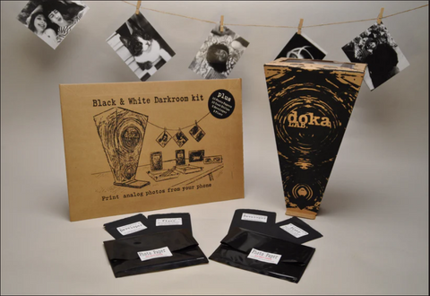 完整的黑白照片冲洗家庭暗房套装。包含冲洗盒、显影液和定影液、相纸、防护装备以及所有必要的配件,如夹子、晾衣夹和悬挂系统。满足您入门传统胶片摄影的所有需求。